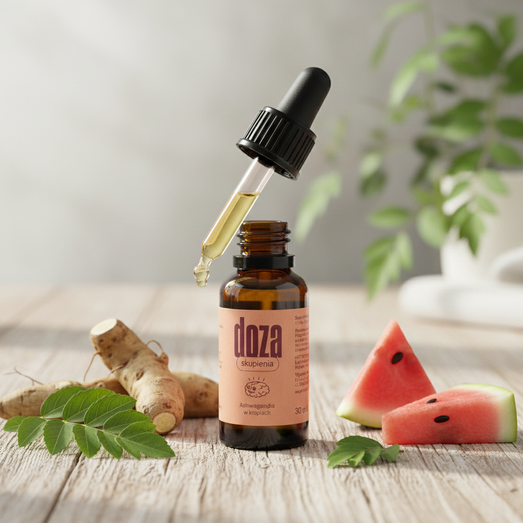 Polecany produkt: Ashwagandha w kroplach – Doza Skupienia to wygodna forma suplementacji, która łączy wysokiej jakości ekstrakt z korzenia ashwagandhy z przyjemnym arbuzowym smakiem. Forma kropli zapewnia szybsze wchłanianie i wygodę stosowania – wystarczy 30 kropli dziennie w porze obiadowej.